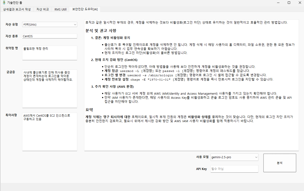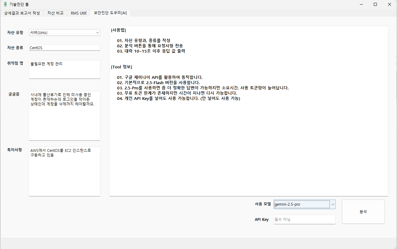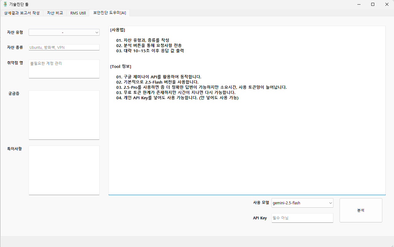네번째 탭은 보안 컨설팅 진단을 할때 궁금한 점들을 빠르게 물어보기 위해 세팅해둔 ai 도우미 탭이다.