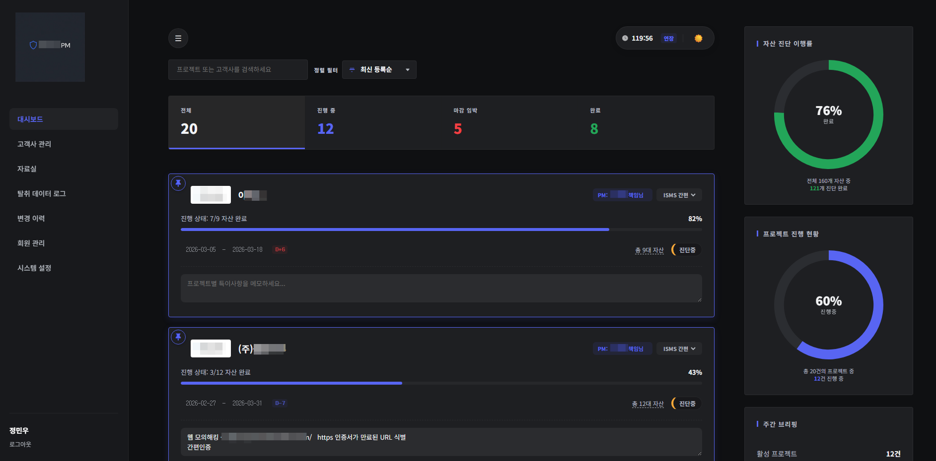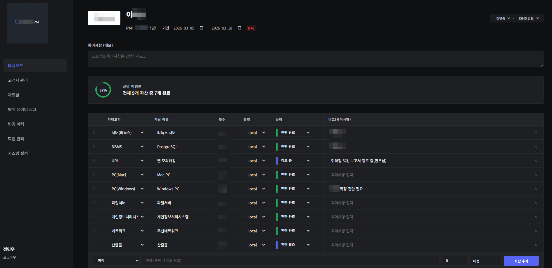 각 고객사의 자산 수, 진행 상황, 진행 상황들을 한 페이지에서 볼 수 있다.