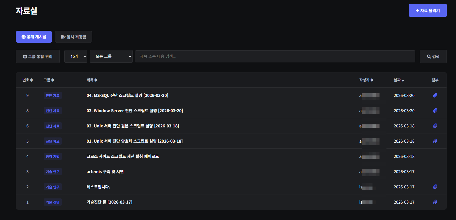 자료실에선 기술팀이 공유할만한 연구자료 혹은 기술 진단 시의 스크립트 최신화를 다루고 있으며