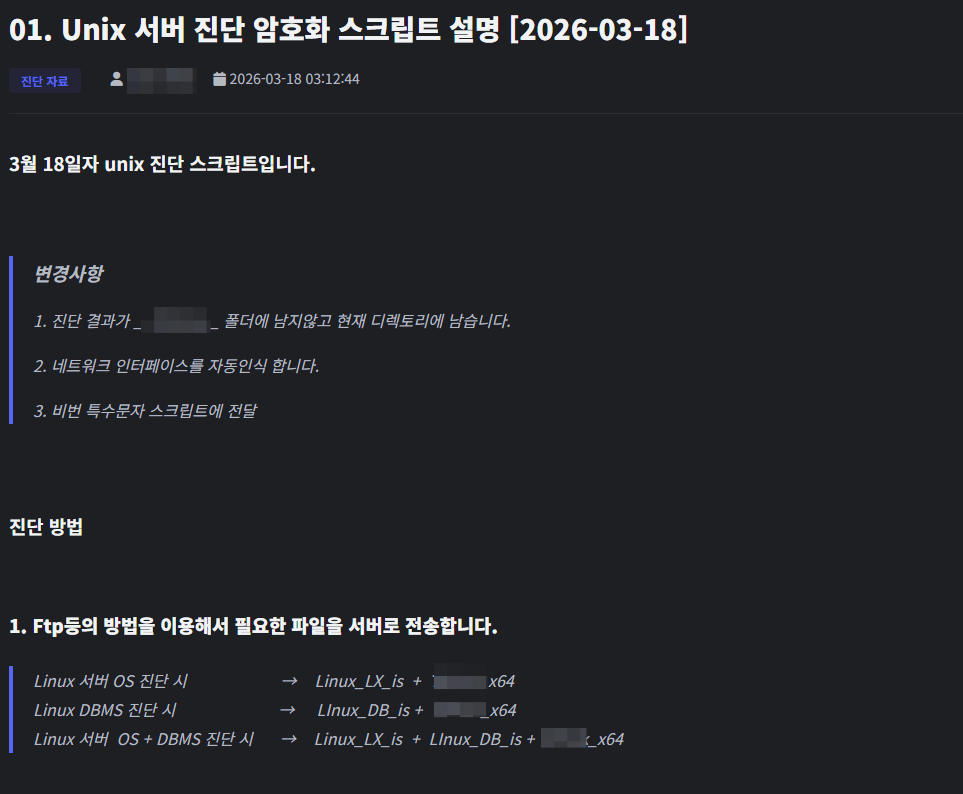 게시글의 내부는 이러하며, pdf 로 게시글 내용의 추출이 가능. 첨부된 스크립트 + 게시글의 설명을 pdf 추출하여 좀 더 편의성 있게 스크립트 유지보수 및 고객사 전달 준비가 가능하도록 함