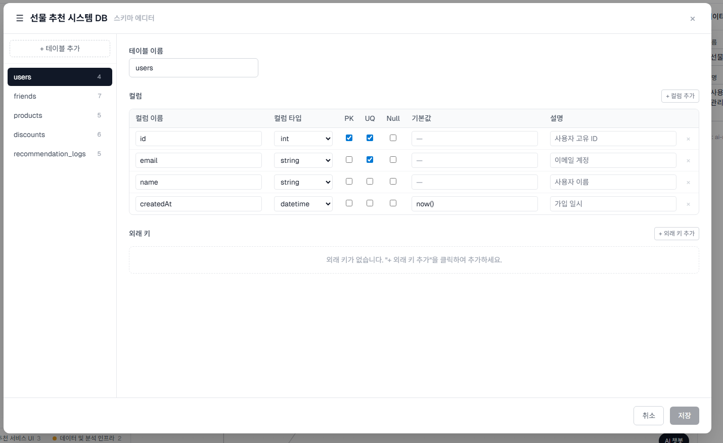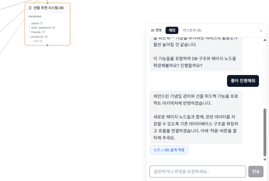 DB 노드들은 상세 페이지에 테이블 및 컬럼 설계도 가능하며, ai가 설계 및 간단한 설명을 남겨주는 것 또한 가능하다.