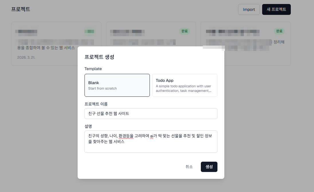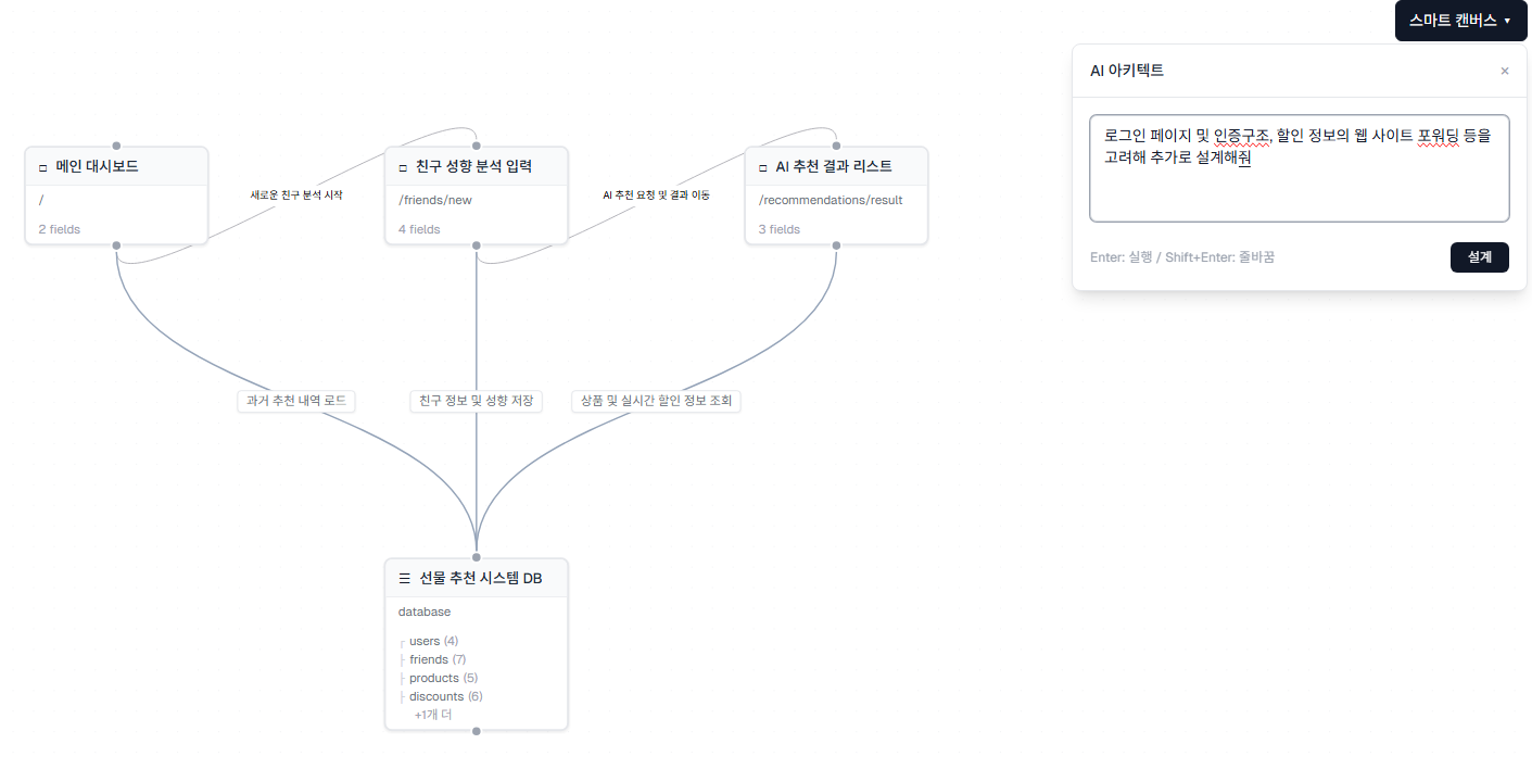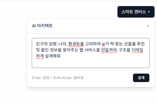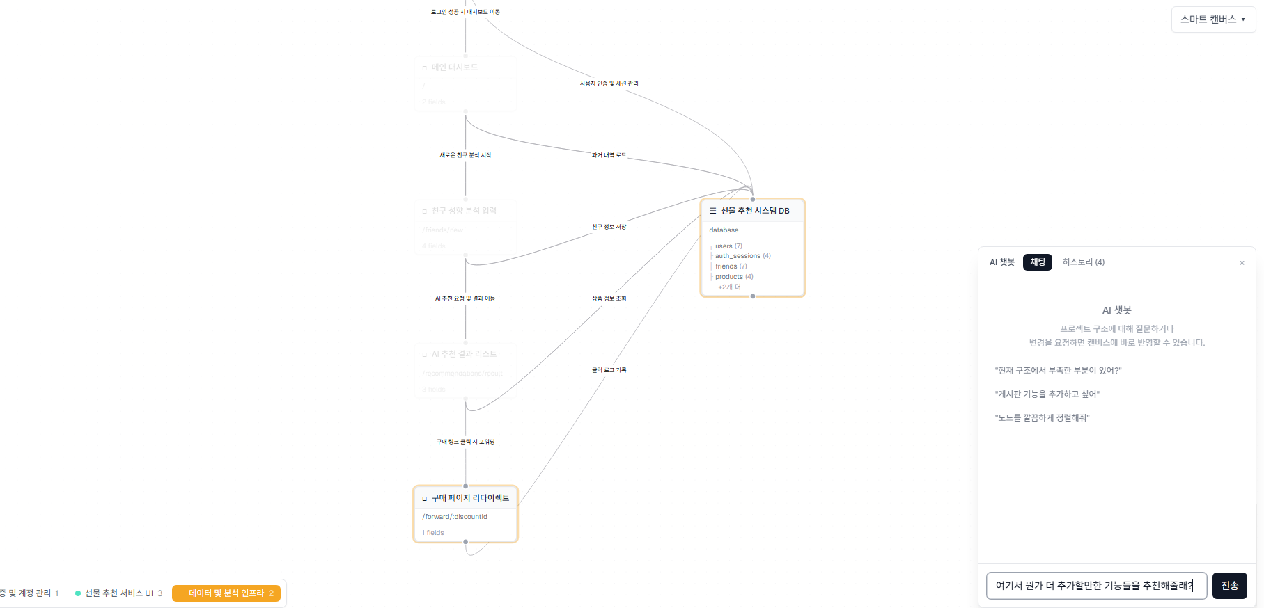 시연을 위해 임의의 프로젝트 생성, 처음엔 빈 템플릿을 가져오므로 오른쪽 위의 스마트 캔버스를 통해 ai를 통해 기본 구조를 생성한다.