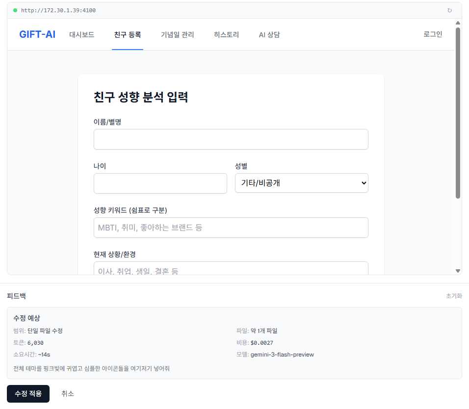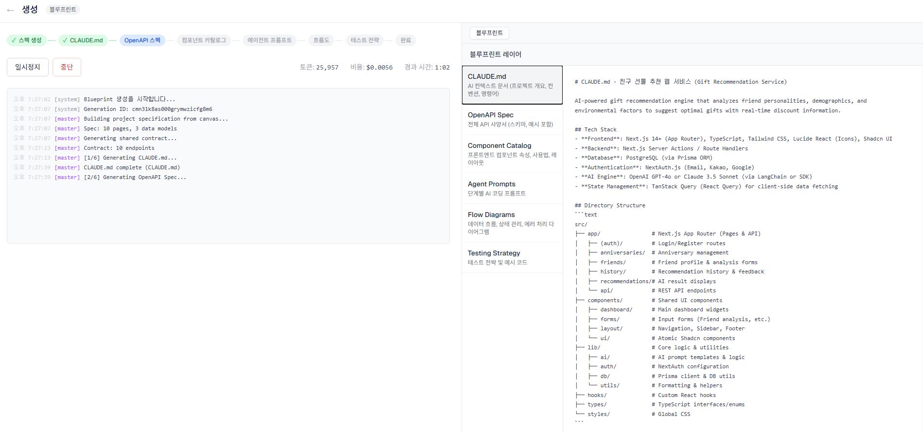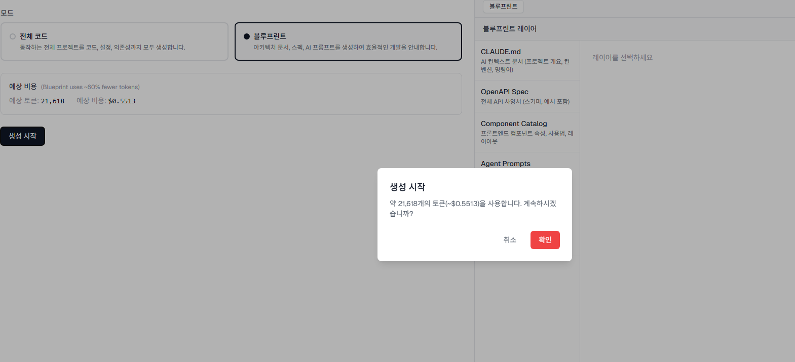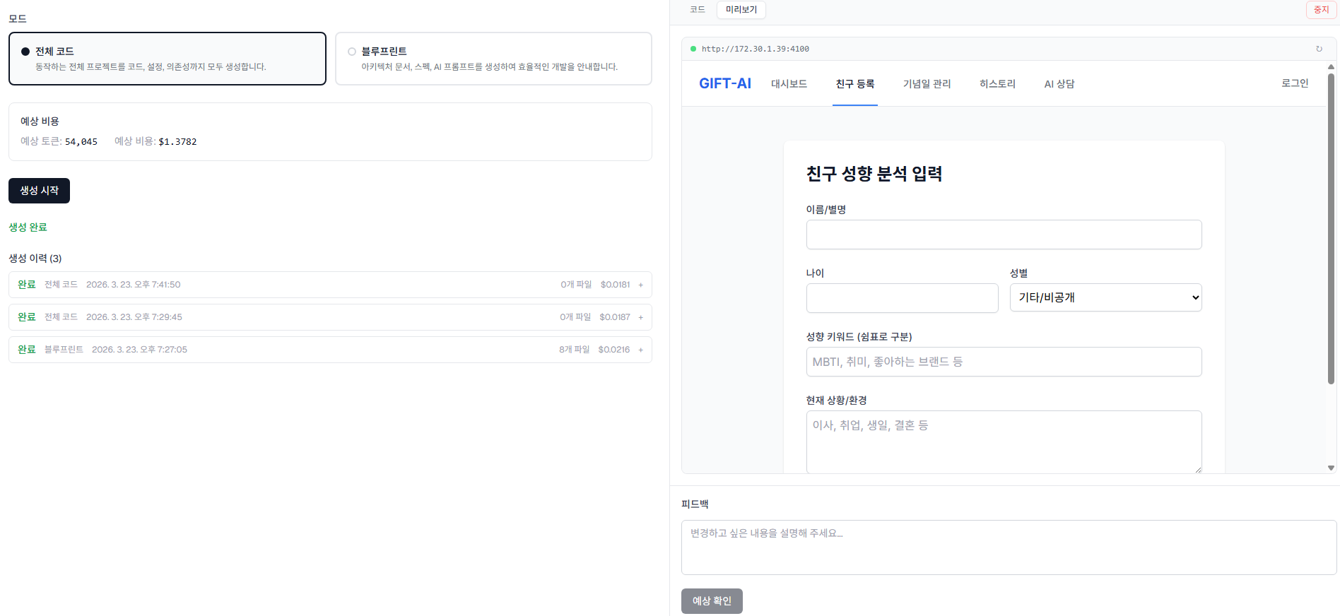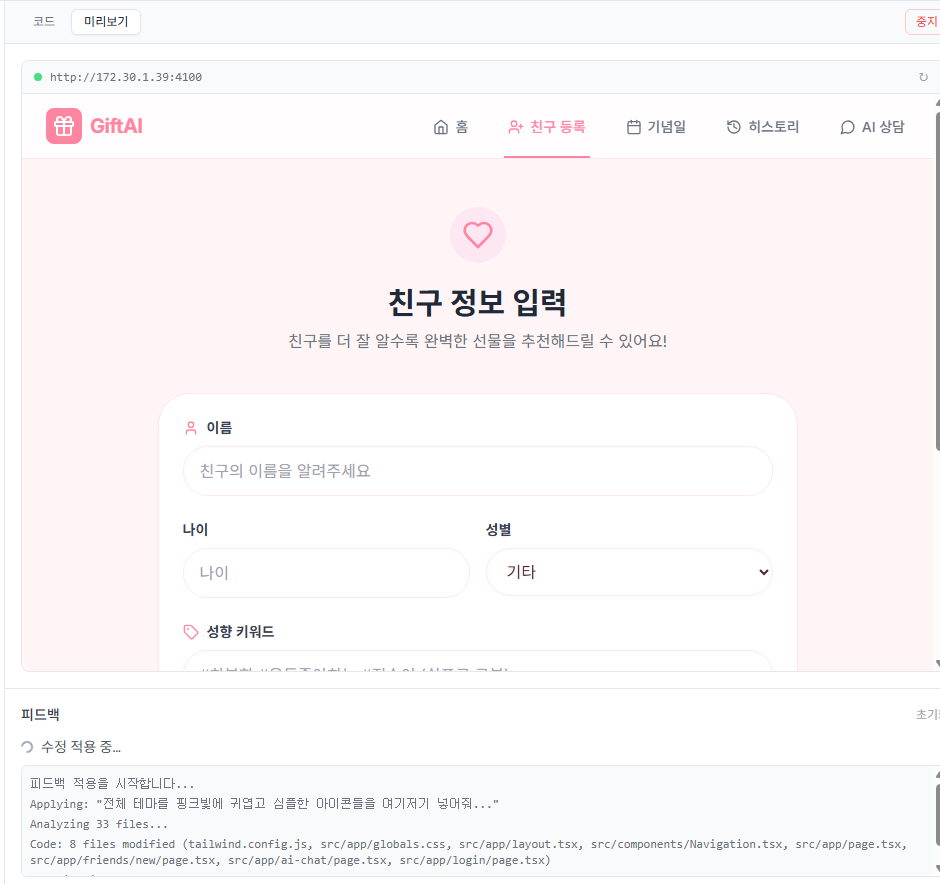 블루프린트가 아닌 전체 코드 생성 시 위와 같이 미리보기 페이지가 생성되며, 즉각적으로 피드백이 가능하다.