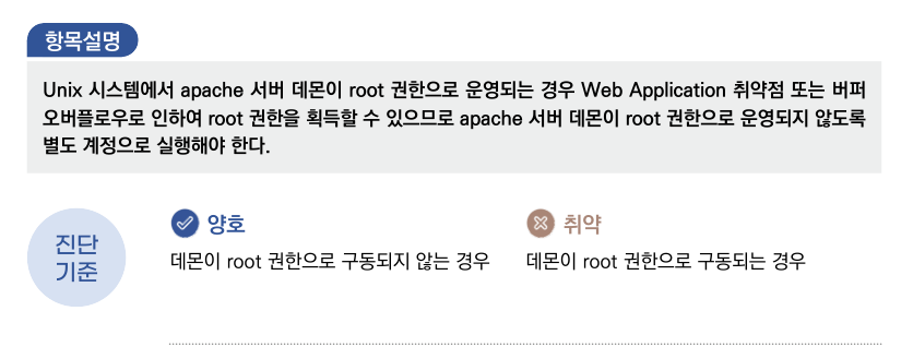 apache 서버 데몬이 root 권한으로 운영될 경우 불필요하게 과도한 권한을 가지고 있으며, 다른 취약점들을 통해 root 권한을 획득 할 수 있으므로