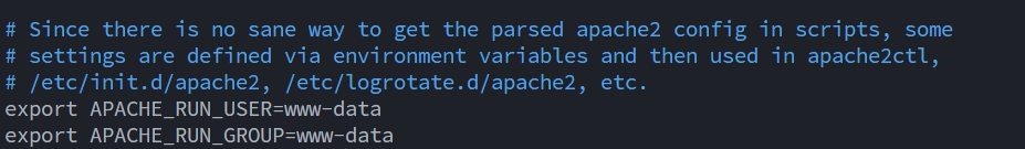 apache2.conf 파일 이 존재하는 경로의 envvars 파일을 확인하면 어떤 계정으로 아파치가 구동이 될지 설정값이 존재한다.