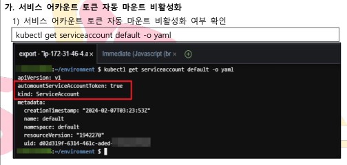 * "automountServiceAccountToken" 옵션이 true로 활성화되어있는것을 확인 (취약)