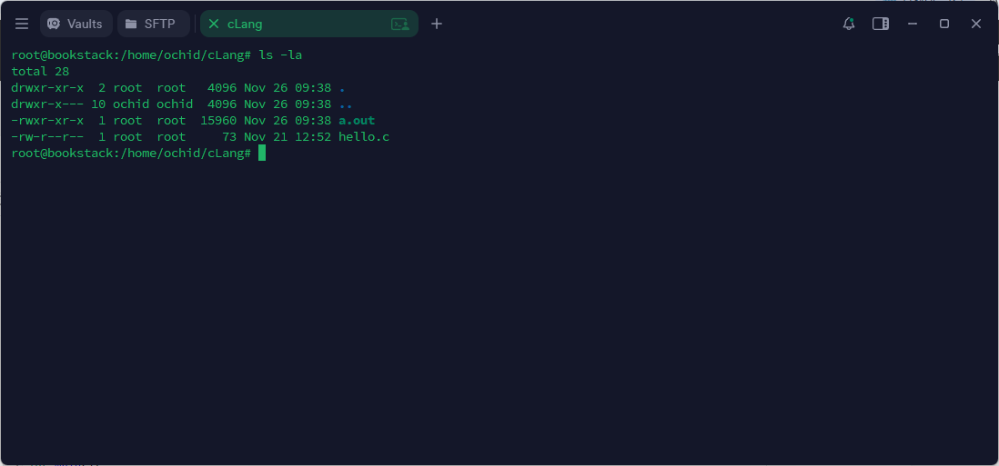 따로 이름을 지정하지 않았으므로 a.out 이라는 파일이 생성되었다.