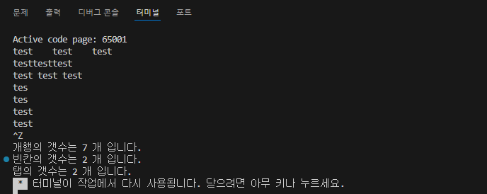 printf("개행의 갯수는 %d 개 입니다.\n빈칸의 갯수는 %d 개 입니다.\n탭의 갯수는 %d 개 입니다.\n", lnCount, blankCount, tabCount);