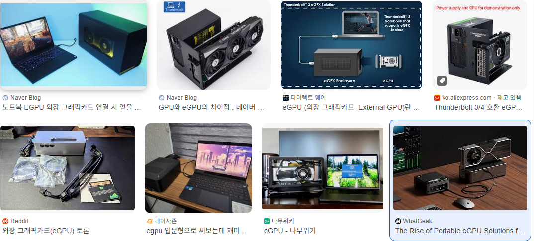 EGPU의 경우 썬더볼트4(c타입 처럼 '생긴') 를 통해서 연결하는 방식이 있지만 성능의 손실이 심하기 때문에