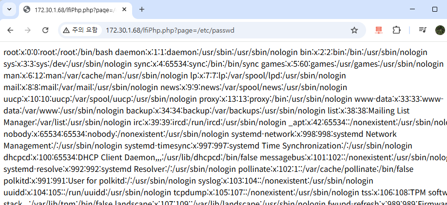 3. /etc/passwd 파일또한 출력이 가능 (로컬에 있는 파일들을 포함하여 php 코드가 실행)